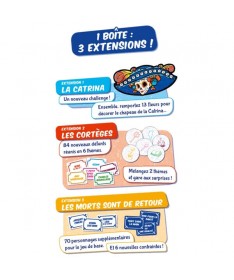 Les morts sont de retour pour une Fiesta de los Muertos encore plus spectaculaire avec l’aide de La Catrina. Dans cette extension, vous trouverez trois modules vous permettant de varier les parties et de renouveler le plaisir du jeu ! Des personnages et des contraintes supplémentaires, et l’ajout de cartes thèmes pour encore plus de surprises ! Cette extension ne manquera pas de vous faire mourir de rire !