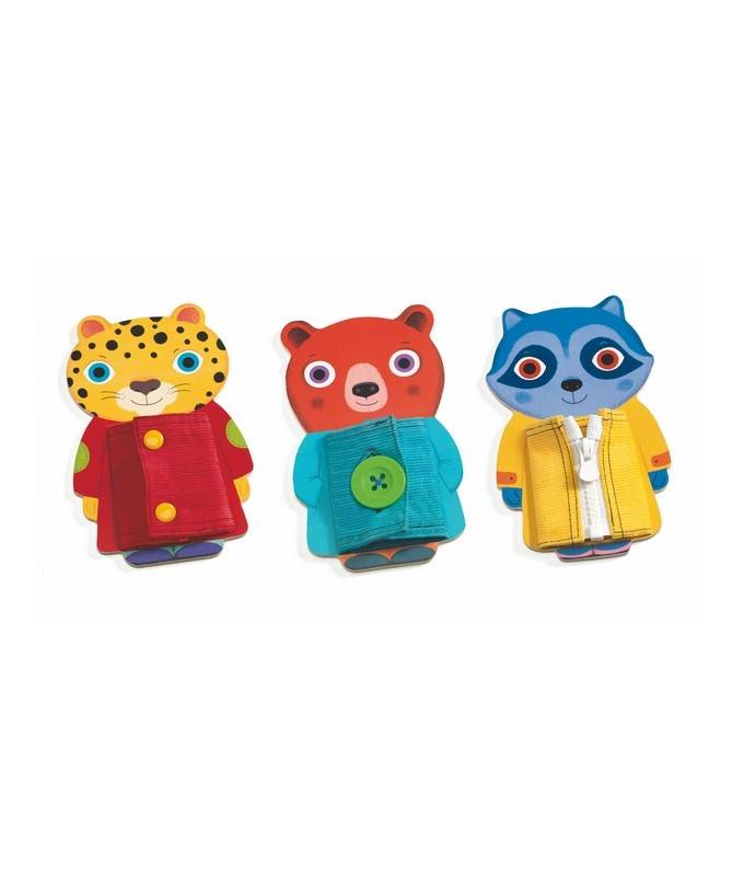 Ce jouet contient 3 personnages en bois à habiller. 3 modes de fermetures : boutons, zip, pressions. Un jeu pour l’apprentissage de l’habillement, dès 3 ans. Composition : bois, tissu, plastique, métal