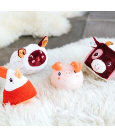 Ce set de 4 hochets se compose d’une poule, d’un cochon, d’un mouton et d’une vache. Chaque hochet présente une forme géométrique, une texture et un son unique. Bébé pourra inventer tout plein de petites histoires avec ses nouveaux animaux.